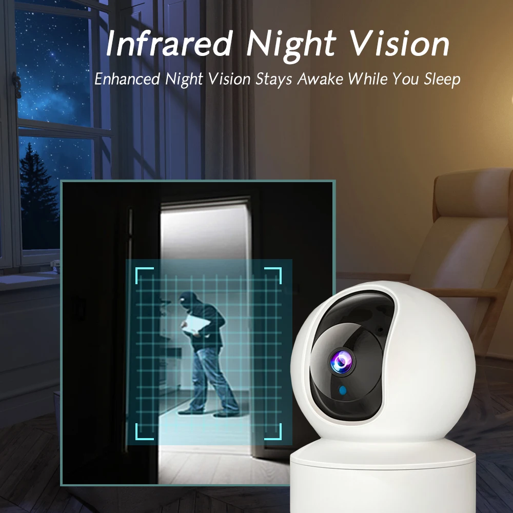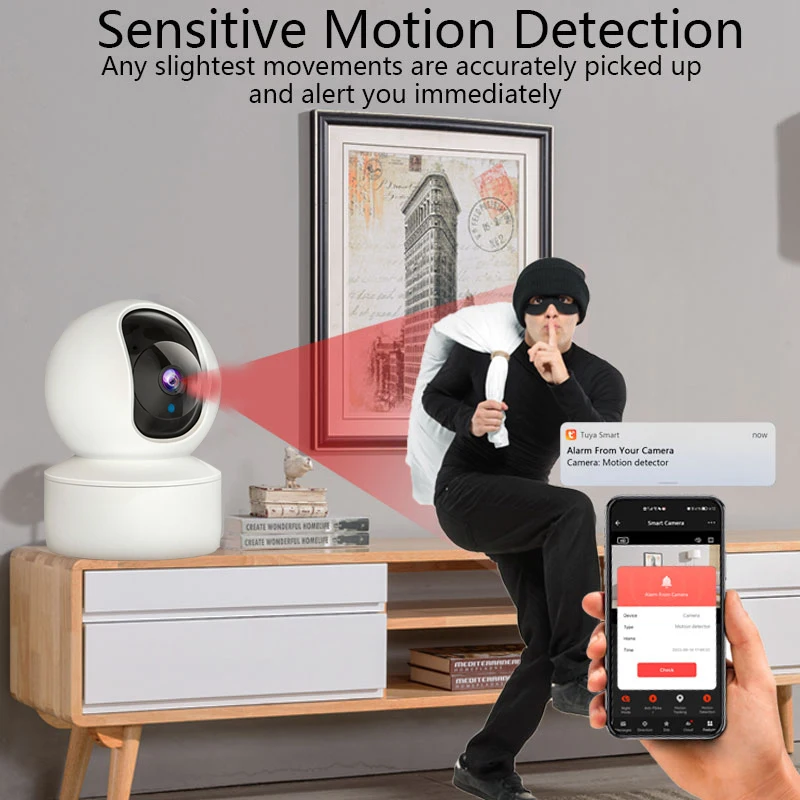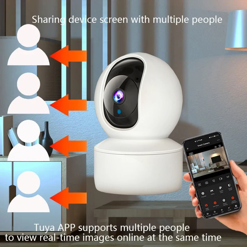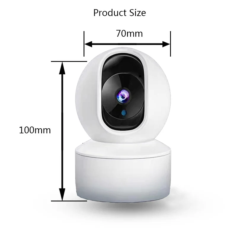 Características:1. Suporte ao App Tuya.2. Suporta a função de mensagem push de alarme e gravará uma imagem da cena do alarme.3. Suporta Detecção de Movimento e monitoramento de rastreamento automático.4. Modo Sem Fio (Wifi).5. Suporta Conversa com Áudio Bidirecional.6. A lente pode ser girada, Pan 355 graus / Tilt 110 graus (Ângulo de monitoramento mais amplo).7. Slot para cartão SD embutido (Suporta no máximo 128GB. Cartão Micro TF).8. Visualize remotamente através do App Tuya no Smartphone.9. Suporta armazenamento de vídeo em nuvem.