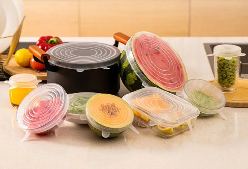 Tampas de silicone transparentes em vários tamanhos. Graças ao seu material elástico, as tampas para alimentos se ajustarão facilmente à maioria das tigelas, potes, recipientes, canecas, copos, latas, jarras, e você pode até usá-las para cobrir seu melão ou melancia cortados pela metade.