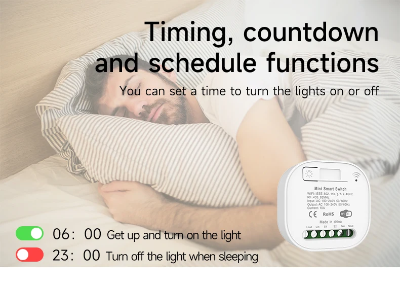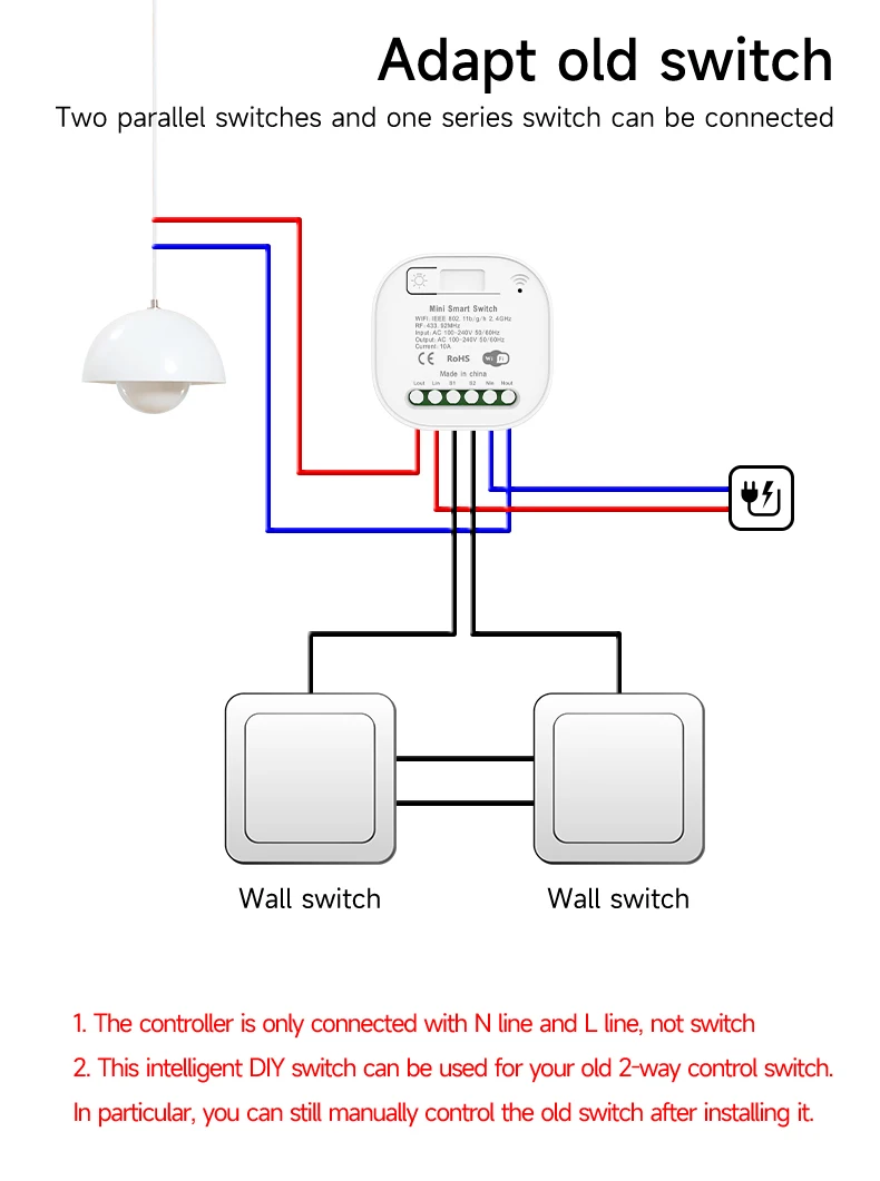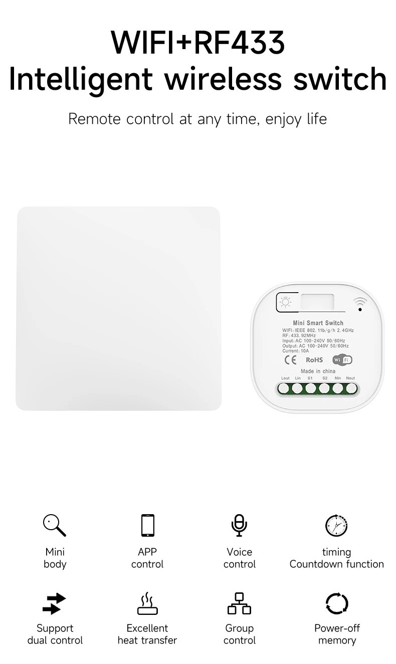Receptor Wifi RF433:1. O receptor wifi RF433 pode ser controlado pelo interruptor sem fio, aplicativo móvel ou conectado aos principais alto-falantes inteligentes para controle de voz.2. Você pode usar o controle remoto RF433Mhz para controlar luzes ou outros aparelhos elétricos sem rede, o que é mais prático do que os controladores apenas com wifi no mercado e adequado para idosos e crianças.3. O receptor adota fiação fase+neutro, sem cintilação, estável e confiável.4. O receptor vem com proteção contra sobrecarga e é feito de material retardador de chamas PC para maior segurança.5. Longa Distância de Controle: Espaço aberto é mais de 150 metros. Ambiente interno suporta transmissão de sinal estável até 20-30 metros.