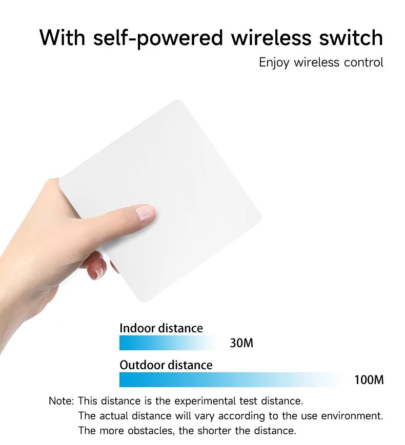 Aviso:1. Nosso produto precisa ser usado com um receptor. A menos que você já tenha comprado nosso produto anteriormente e precise comprar acessórios adicionais, comprar um transmissor ou receptor separadamente não funcionará.2. Nosso produto usa comunicação RF433, mas não pode ser misturado com outros produtos RF433 porque, além da frequência, ele também precisa atender aos requisitos de velocidade de decodificação e codificação.3. O controle sem fio не requer fonte de alimentação e pode ser usado ao ar livre ou em ambientes úmidos. Pressionar para gerar eletricidade не representa risco de choque elétrico.4. Desligue toda a energia antes de instalar o receptor.5. Não pode ser instalado dentro de uma caixa de metal, pois o metal bloqueará os sinais e não poderá ser usado.