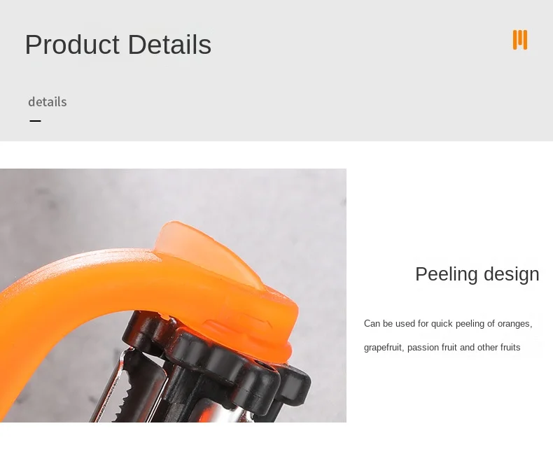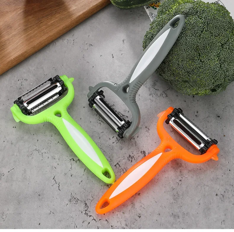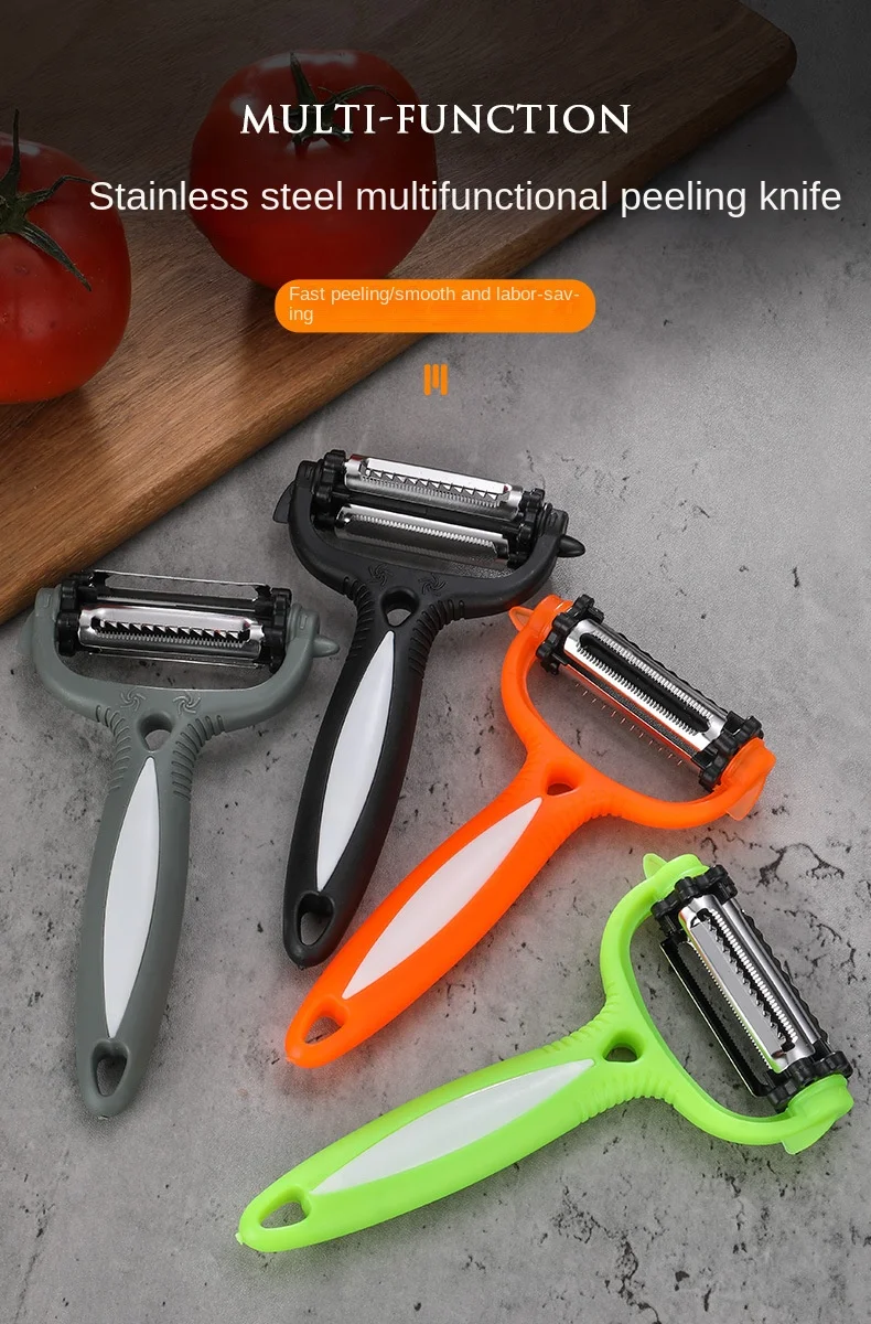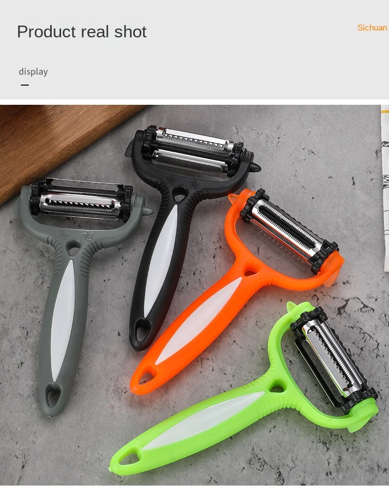 Este é um descascador multifuncional com lâminas rotativas de 360 graus. Ele tem 3 tipos de lâminas que podem ralar alimentos em diferentes tipos de formas. Os lados afiados e convexos podem ser usados para descascar frutas como laranja. É uma ferramenta de cozinha perfeita para a dona de casa.