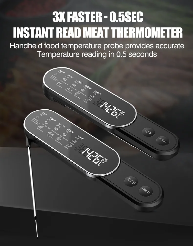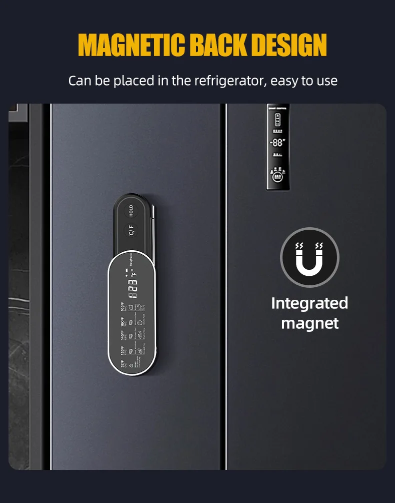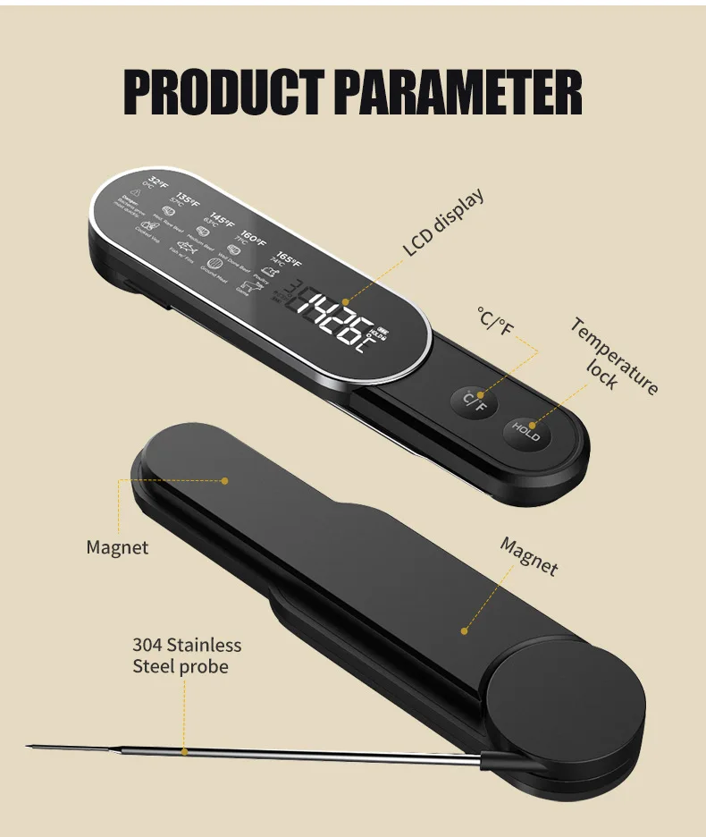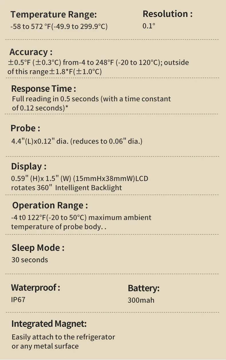 Especificações:Faixa de Temperatura: -58 a 572 ℉ (-49.9 a 299.9℃)Precisão: ±0.5℉(±0.3℃) de -4 a 248℉(-20 a 120℃); Fora desta Faixa ±1.8℉(±1.0℃) Resolução: 0.1°Tempo de Resposta: Leitura completa em 0.5 segundos (com uma constante de tempo de 0.12 segundos)*Modo de Suspensão: 30 segundosSonda: 4.25" (Aprox. 10.8 cm) (L) x 0.12" (Aprox. 0.3 cm) diâm. (reduz para 0.06" (Aprox. 0.15 cm) diâm.)Ímã Integrado: Anexa-se facilmente à geladeira ou qualquer superfície de metalFaixa de Operação: -4 a 122°F(-20 a 50℃)Temperatura ambiente máxima do corpo da sonda.