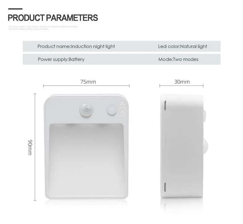 Especificações:Nome: Luz Noturna com Sensor de Movimento para EscadaFonte de luz: 2835 SMDQuantidade de LED: 2pçsCor da luz: Branco NaturalTemperatura de cor: 4000-4500KPotência: 1WTensão: 4.5V (ou 3 Pilhas AA)Alimentado por: 3*Pilhas AA (não incluídas)Distância de detecção: 3MÂngulo de detecção: 120 grausMaterial: ABS+PC